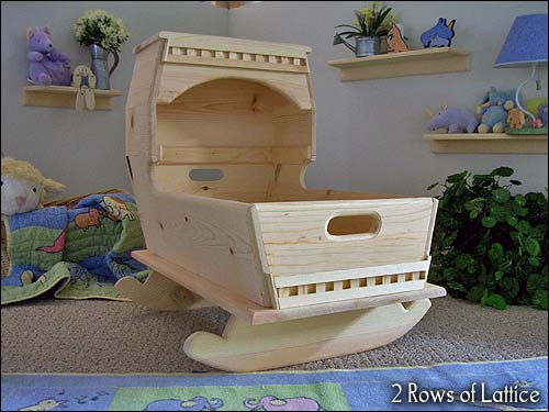 Lattice is an ornamental framework of criss-crossed pattern wood strips. Lattice can be added to footboards of any cradle and to headboards of hooded cradles. Up to five rows of lattice may be added to footboards (if round) and four to headboards (if full compartment). All lattice regardless of number of rows is $16.00 per headboard or footboard. Depending on the choice of cradle, lattice may be mixed with dentil with very pleasing results.