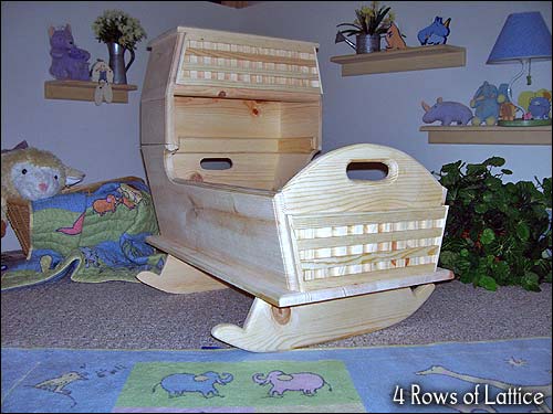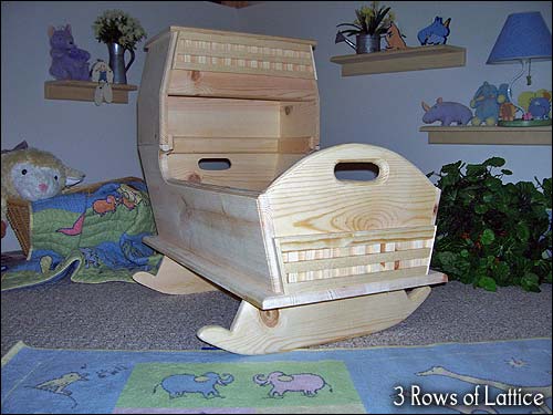 Lattice is an ornamental framework of criss-crossed pattern wood strips. Lattice can be added to footboards of any cradle and to headboards of hooded cradles. Up to five rows of lattice may be added to footboards (if round) and four to headboards (if full compartment). All lattice regardless of number of rows is $16.00 per headboard or footboard. Depending on the choice of cradle, lattice may be mixed with dentil with very pleasing results.